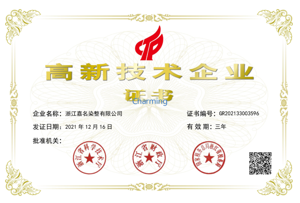 企业已通过ISO9001质量体系认证、ISO14001环境体系认证、Oeko-Tex Standard 100国际生态纺织品认证、OCS有机产品认证、GRS全球回收标准认证。嘉名人将以新发展理念为引领,着力开发“绿色、科技、时尚、智慧”的新产品,不断增强企业的核心竞争力,朝着“致力成为国内外知名服装品牌的首选面料供应商”的企业愿景迈进。